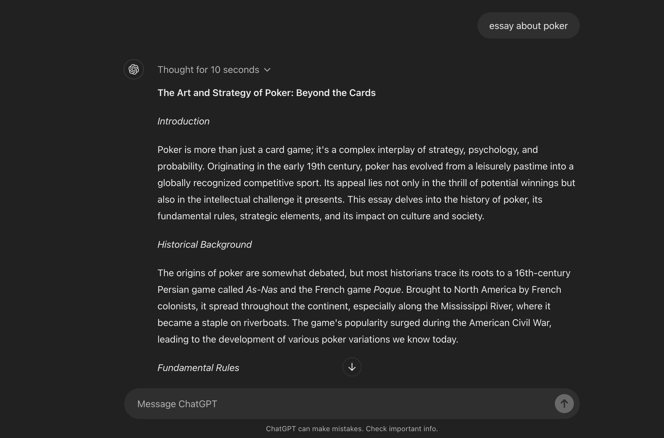 It’s rather easy. You can probably be your own ChatGPT detector by finding word choice that is too precise or simple. Still, most people will just employ an AI content detection systems to give them a result that backs up their suspicion.One of the best AI Detectors is AI Detect, which allows you to access a free tool at first, with just as much power, if not more, than Turnitin. So, lets generate an essay with ChatGPT to run through AI Detect. Here it is: