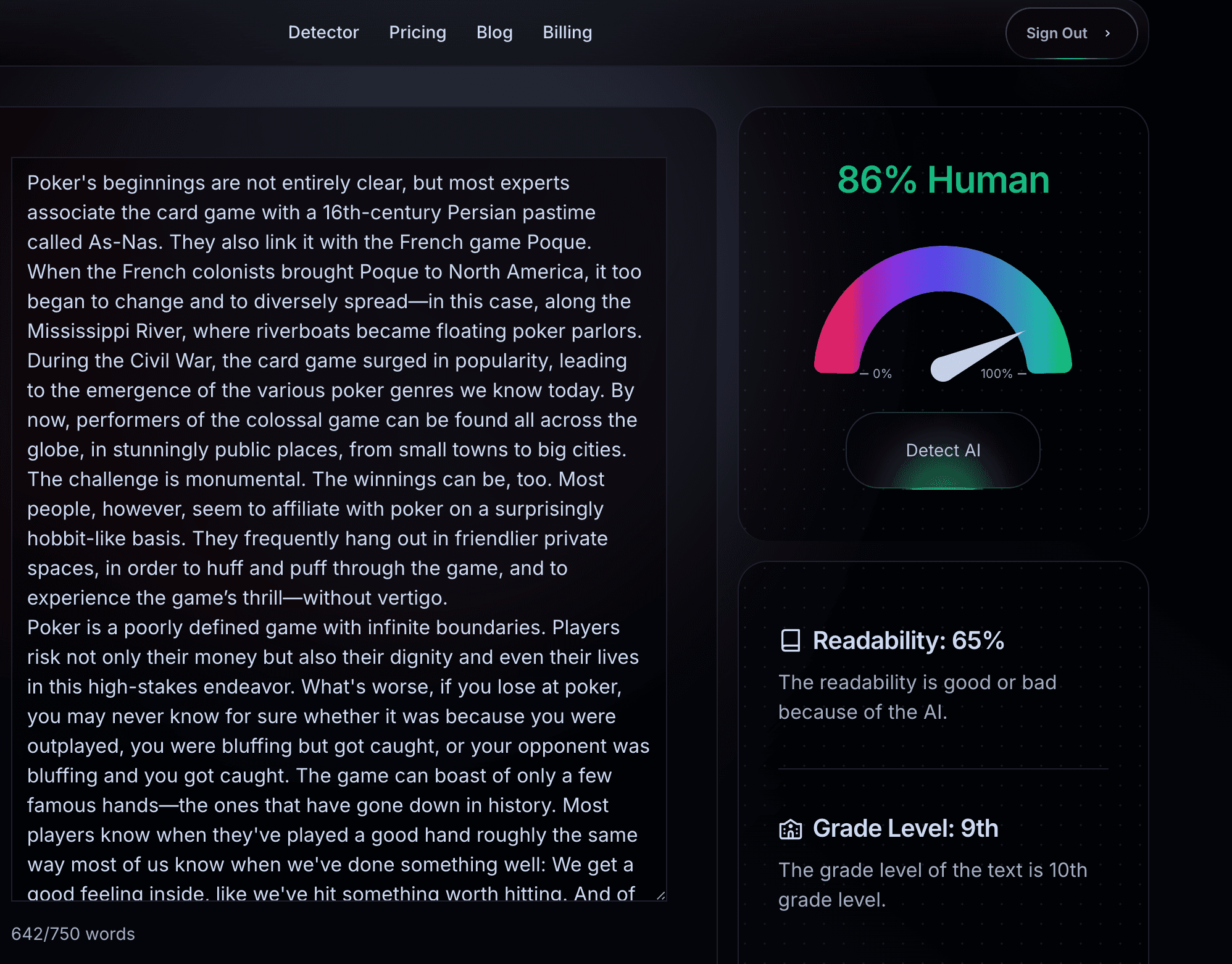 As you can see, AI Detect determined the text was 1% Human and given it was so clearly AI writing, the readability score of 38% also shows us how robotic the writing style feels.